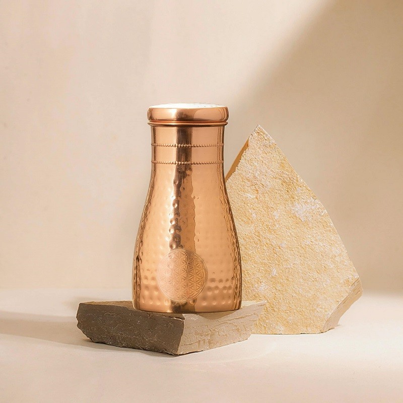 Uważność w każdym łyku. Kwiat Życia kunsztownie zdobi ręcznie kutą miedzianą powierzchnię symbol energii, połączenia i świadomości.