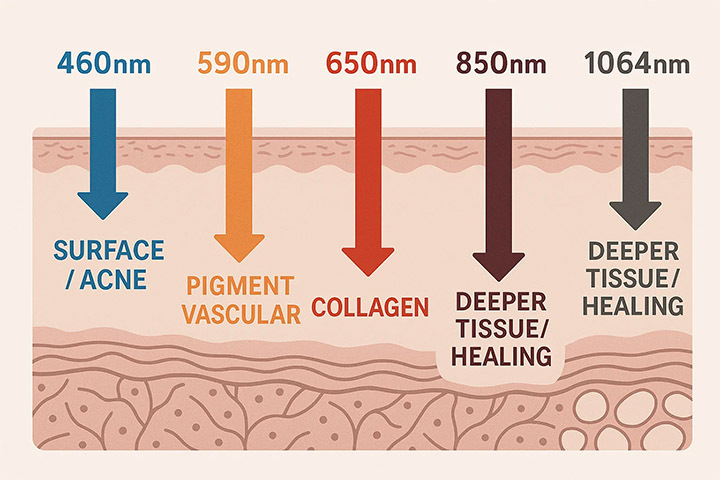 Nasza maska wyposażona jest w aż 352 diody LED – więcej niż większość urządzeń premium na rynku. Zapewnia profesjonalną moc światła ok. 35 mW/cm², równomierne pokrycie całej twarzy i pięć długości fal (460–1064 nm), które działają na wszystkich poziomach skóry: od redukcji trądziku po pobudzenie kolagenu i regenerację.